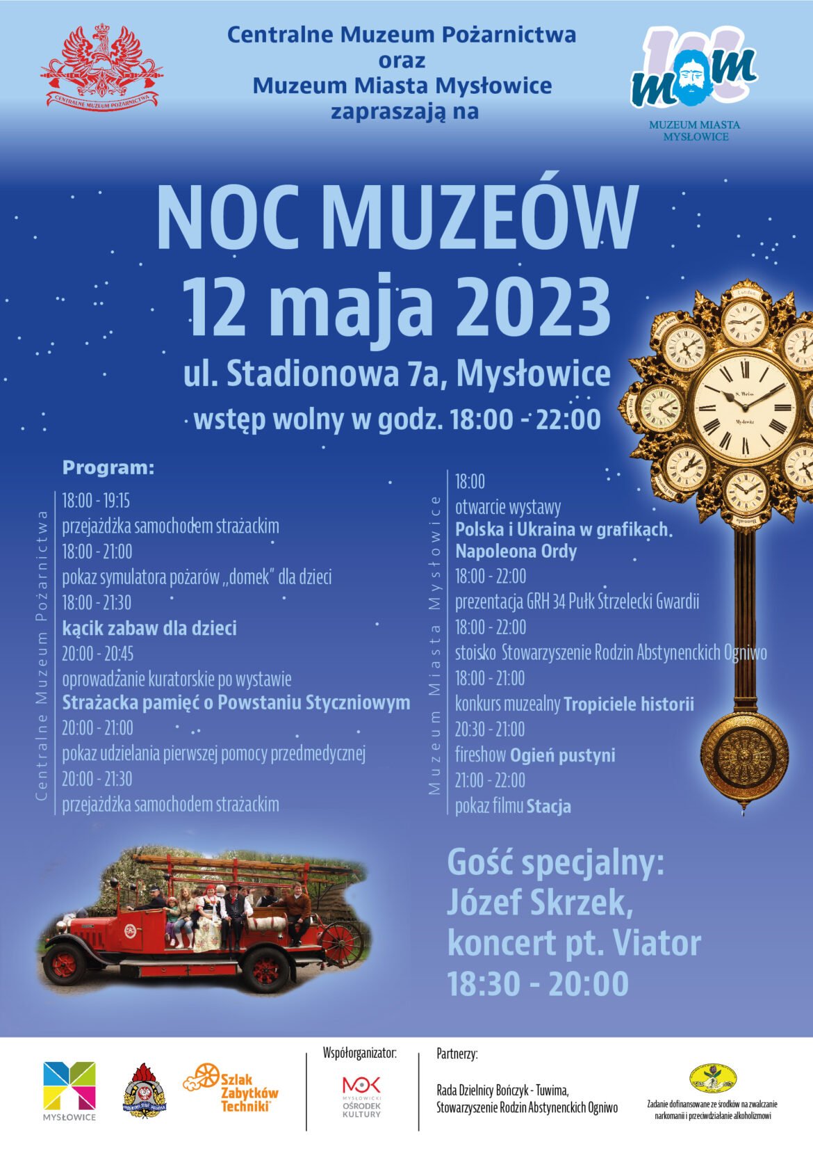 Ogólnoeuropejska edycja Nocy Muzeów odbyła się w Mysłowicach 12 maja br. Tym razem wydarzenie zorganizowały wspólnie Centralne Muzeum Pożarnictwa i Muzeum Miasta Mysłowice. Gwoździem programu był półtoragodzinny koncert Józefa Skrzeka. Legendarny multiinstrumentalista wystąpił w klimatycznej scenerii, na którą składały się zabytkowe sprzęty strażackie. Nastrojowej muzyki elektronicznej wysłuchał komplet publiczności. W sąsiednich halach funkcjonowały stoiska z