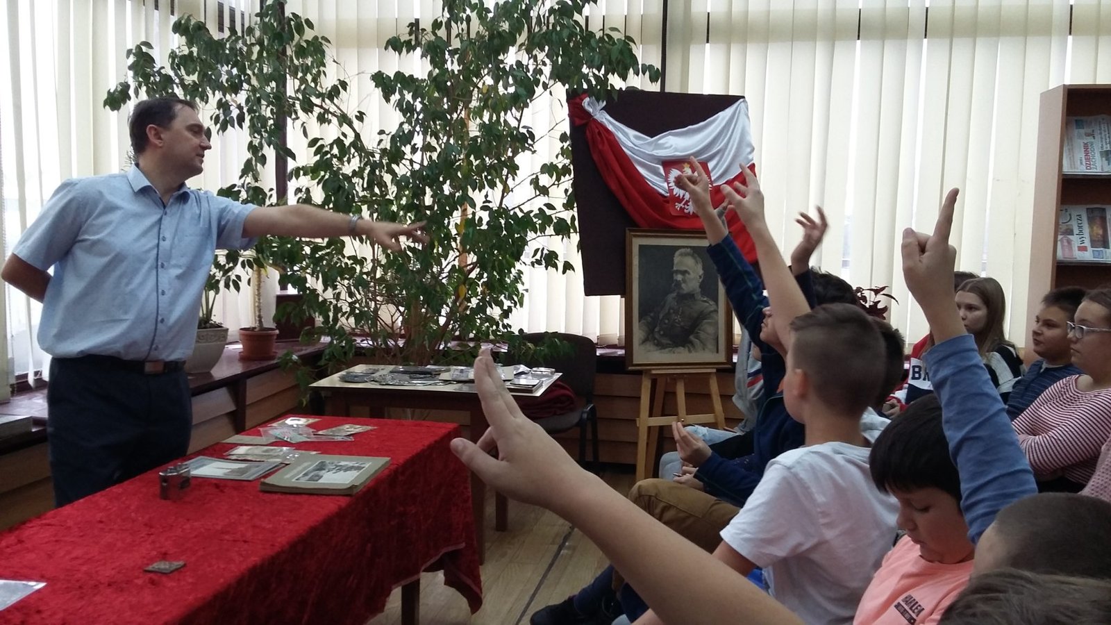 Objazdowa lekcja muzealna CMP pt. „100-lecie odzyskania niepodległości w zbiorach kolekcjonerskich” odbyła się 20 listopada br. w bibliotece miejskiej w Mysłowicach. Tym razem uczestniczyło w wydarzeniu 50. uczniów klas szóstych ze szkoły podstawowej nr 1 w Mysłowicach. Zajęcia przeprowadził Dariusz Falecki.