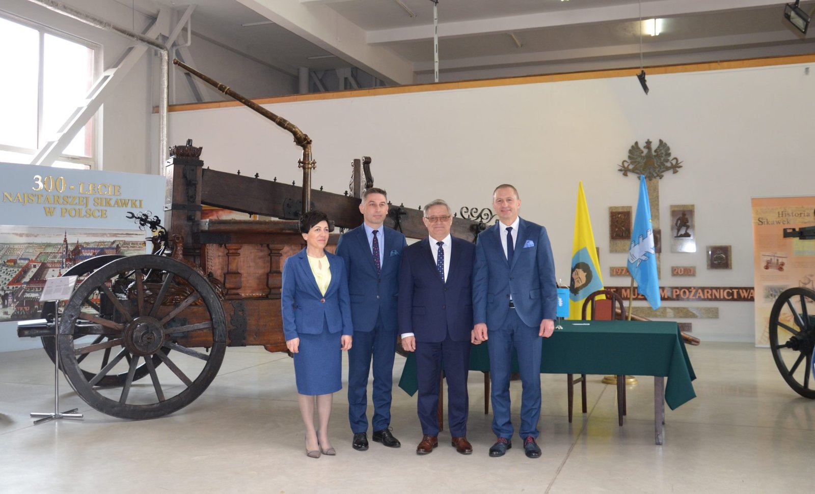 do którego pozowali pracownicy CMP, w mundurach strażackich.