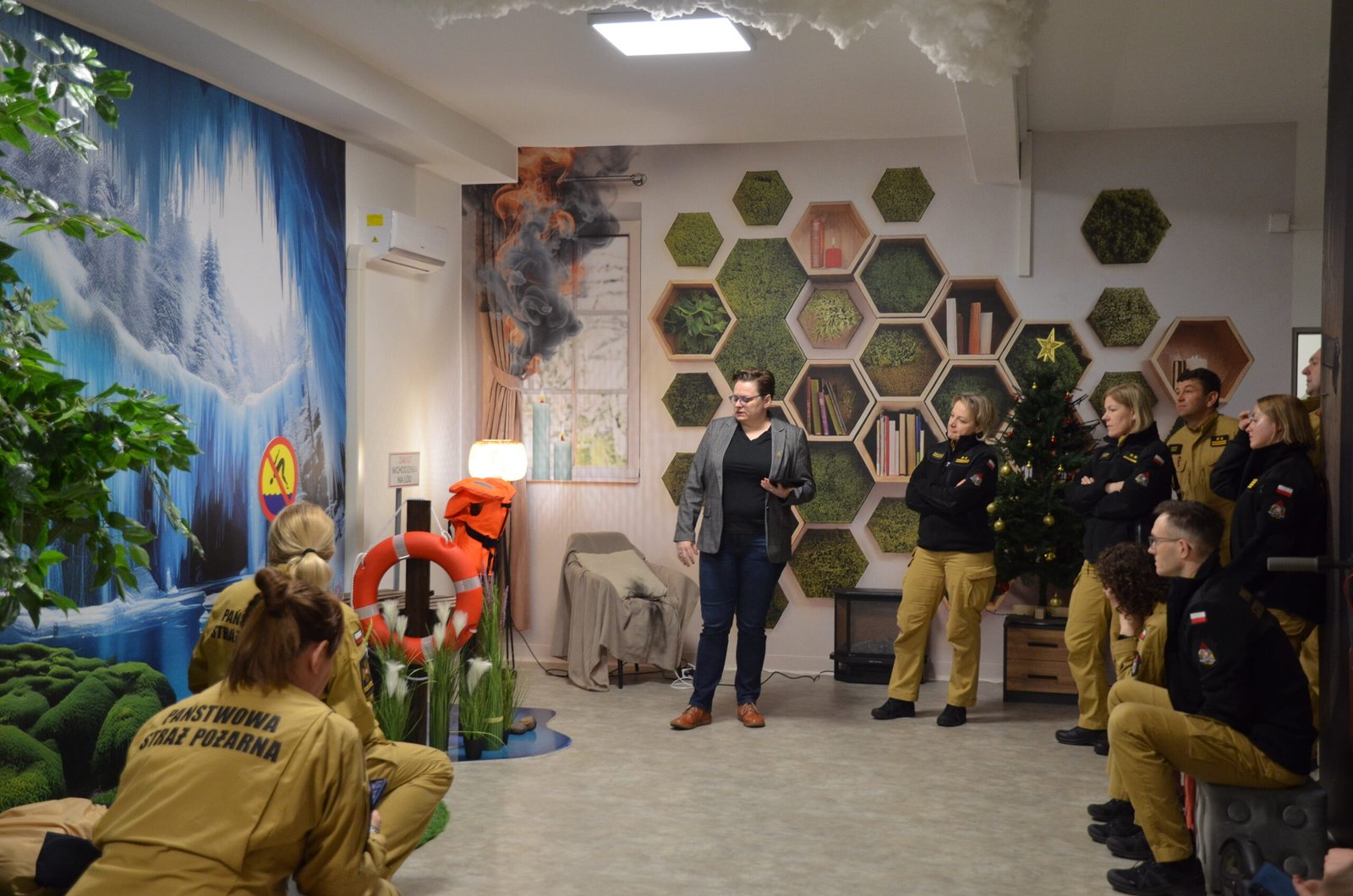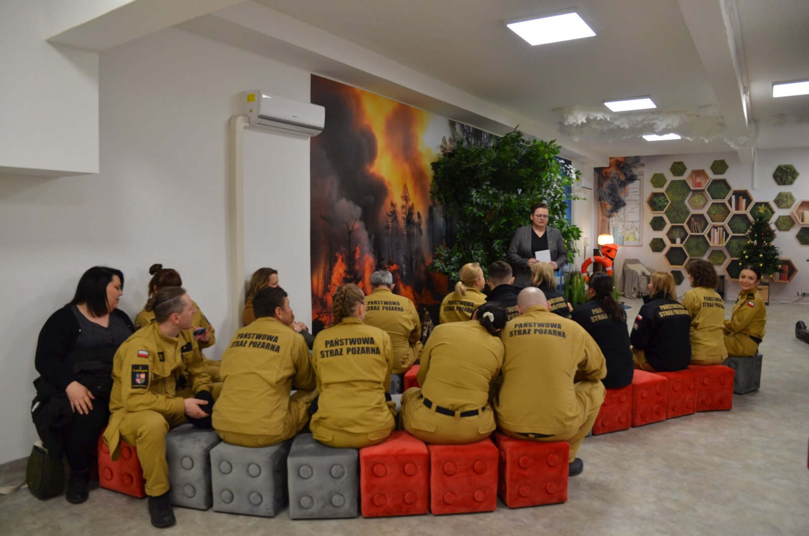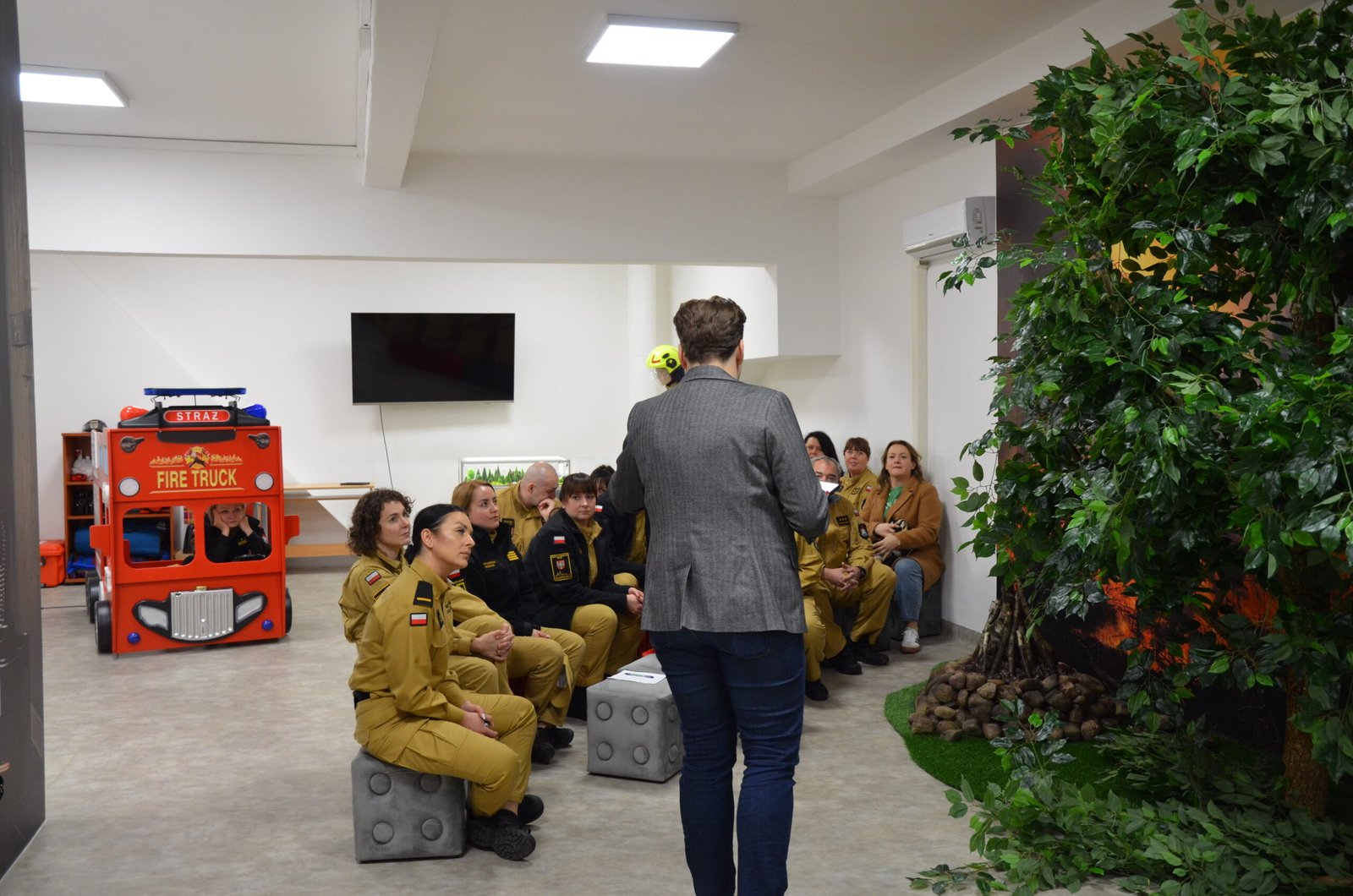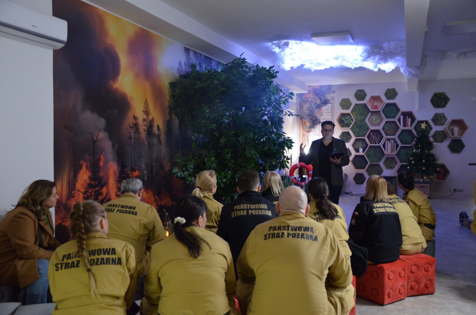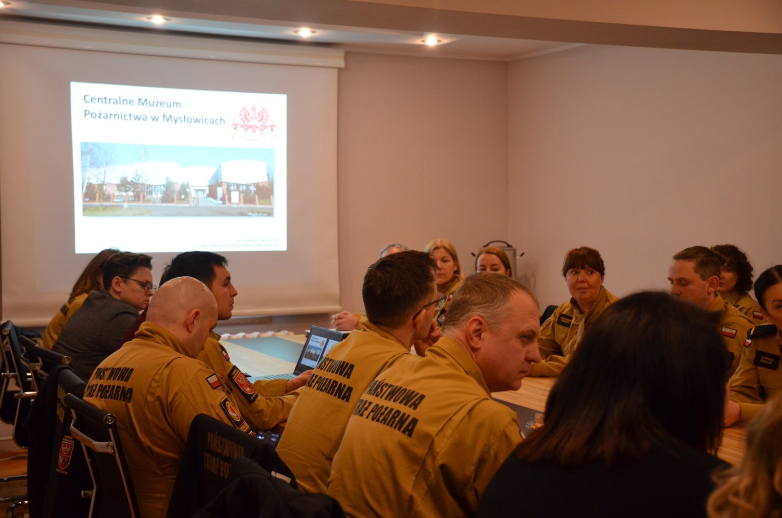 Grupa funkcjonariuszy pożarnictwa uczestnicząca w lekcji na Multimedialnej Sali Edukacyjnej