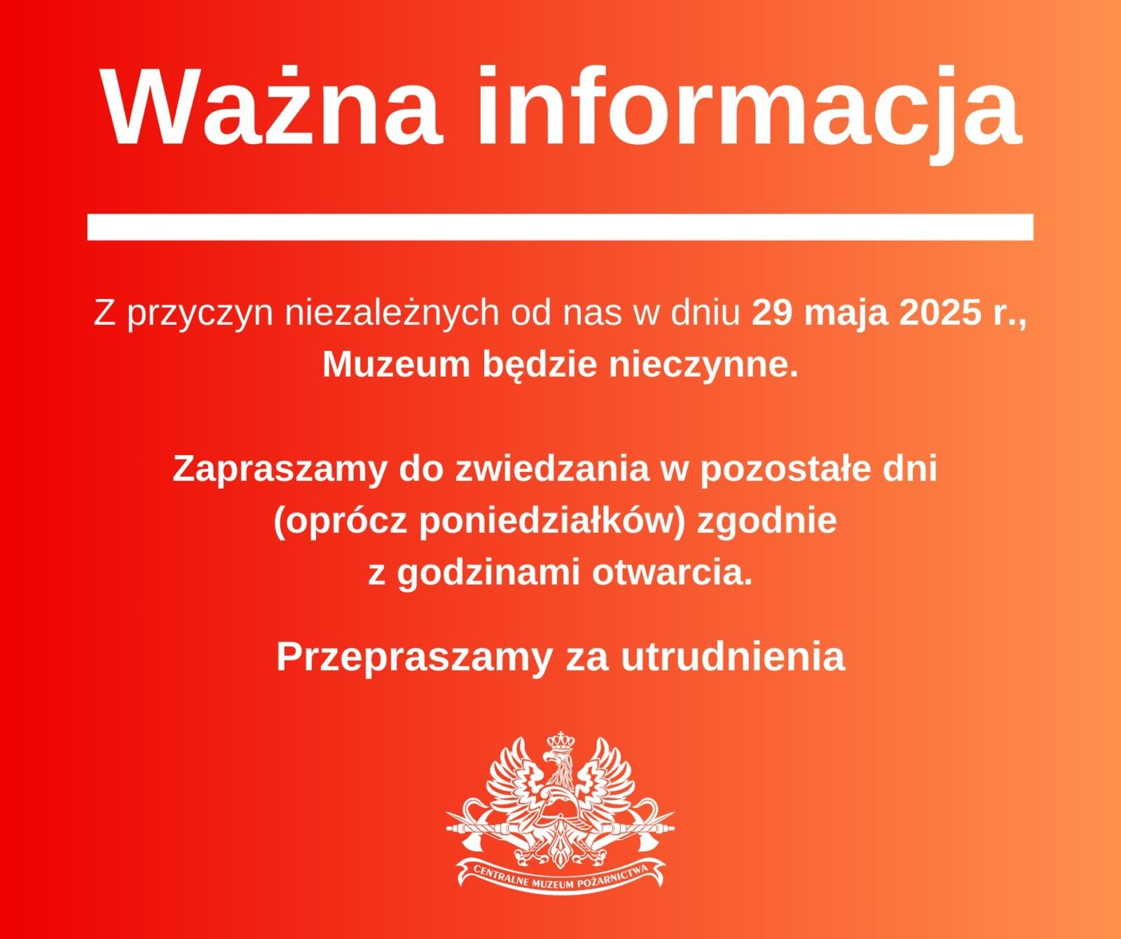 W dniu 10 maja 2025 r. pracownicy Centralnego Muzeum Pożarnictwa mieli okazje uczestniczyć w Wojewódzkich Obchodach Dnia Strażaka w Nysie. Główna część uroczystości odbyła się w Bazylice pw. św. Jakuba Apostoła i św. Agnieszki oraz na rynku w Nysie. Następnie korowód strażacki przejechał przez centrum miasta pod Halę Nysa, gdzie odbywał się Piknik Strażacki. Centralne